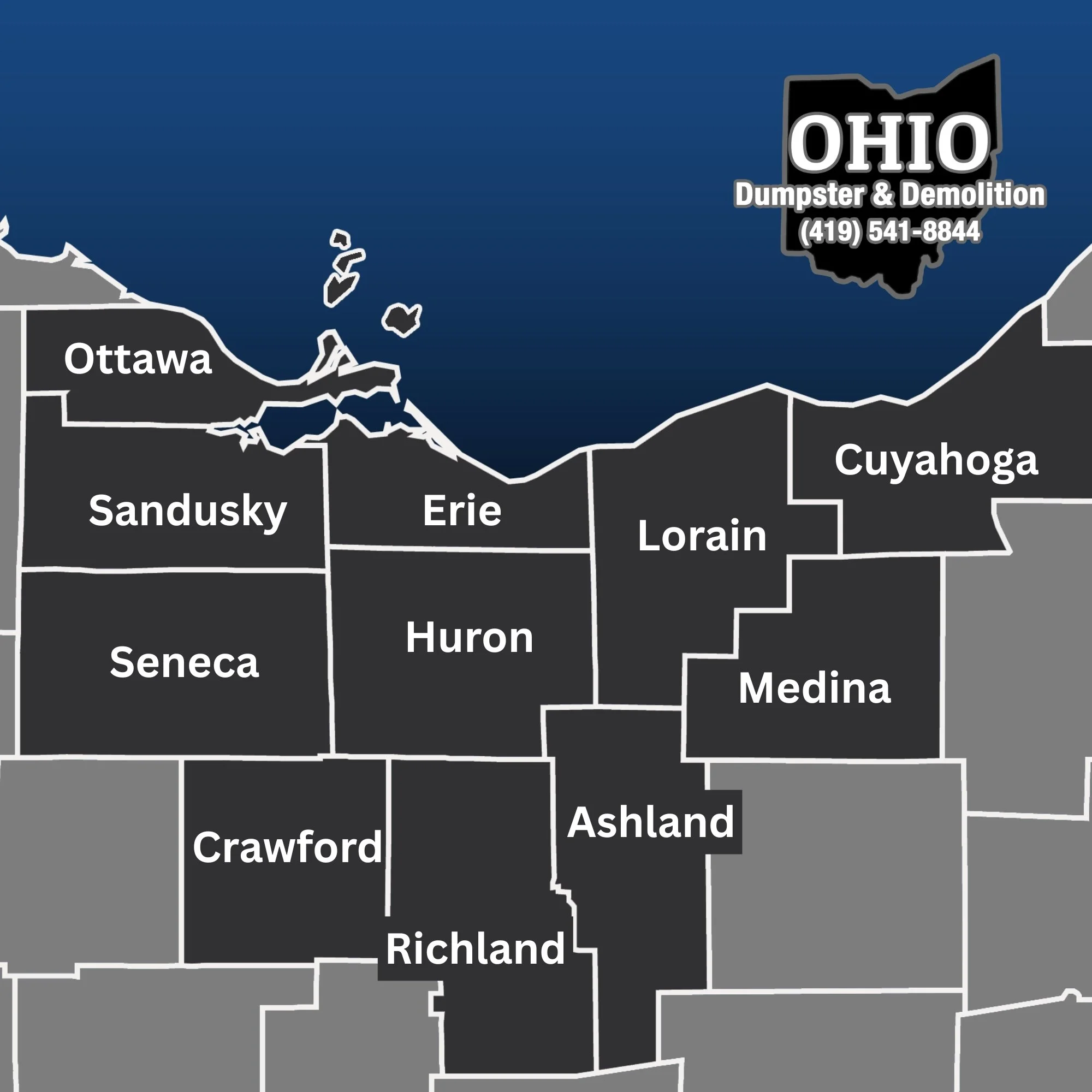 Ohio Dumpster & Demolition is based in Milan, Ohio and proudly serves Erie, Huron, Lorain, Ottawa, Seneca, Sandusky, Crawford, Richland, Cuyahoga, Medina & Ashland counties. Offering SAME DAY DELIVERY.